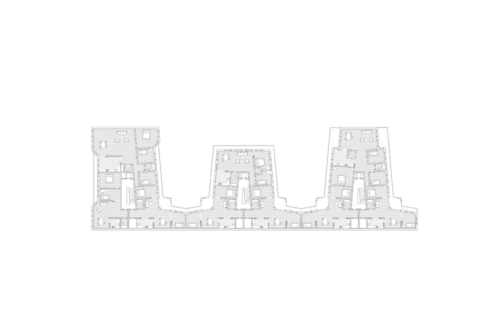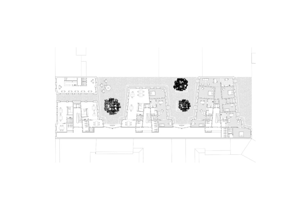 A key challenge was the depth of the floor plan and its predominantly north-facing orientation. The main objective was to create high-quality residential units with east–west orientation while achieving maximum urban infill. Commercial spaces were placed on the ground floor of the front building and in the first courtyard.