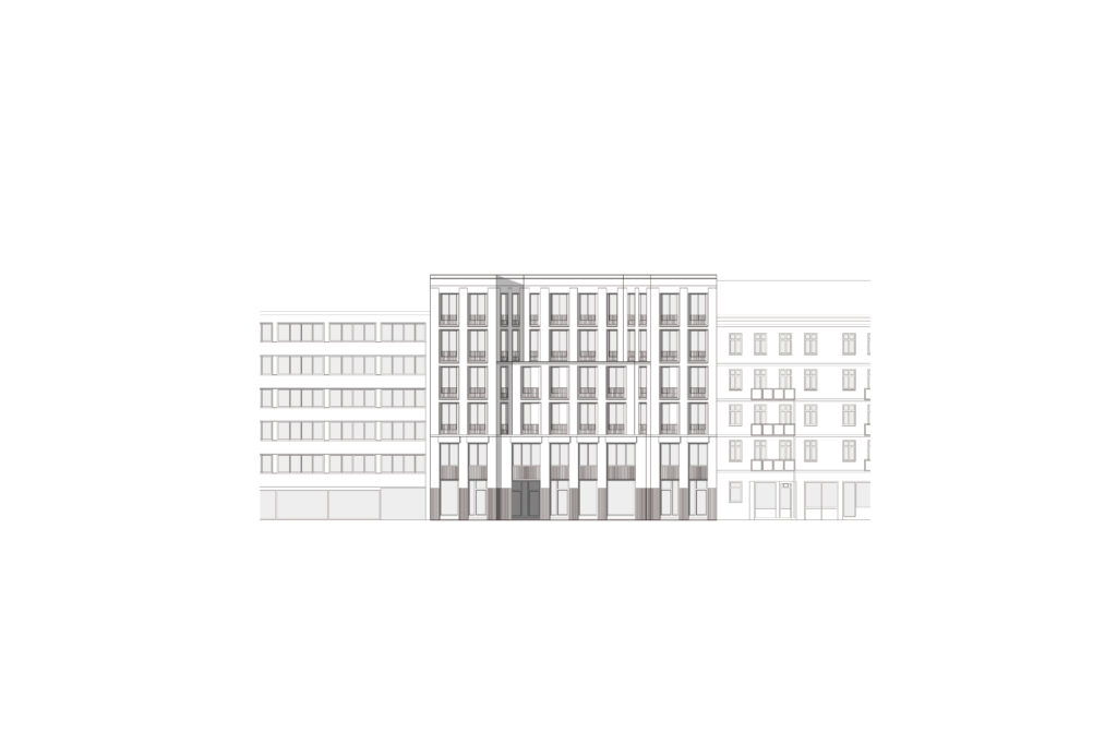 The design responds to the historic mixed-use residential and commercial buildings of the early 20th century, offering a contemporary reinterpretation. It also incorporates development along a deep party wall of the neighboring property.